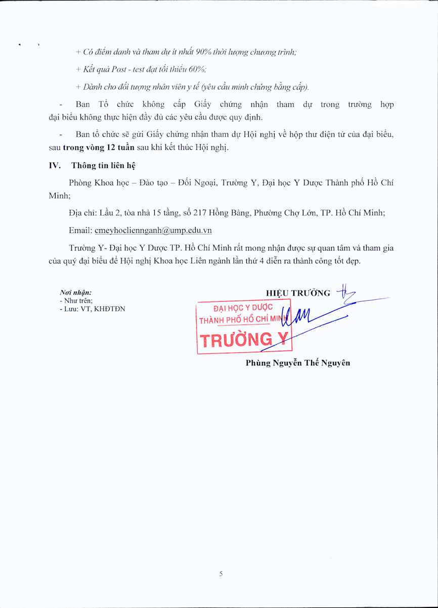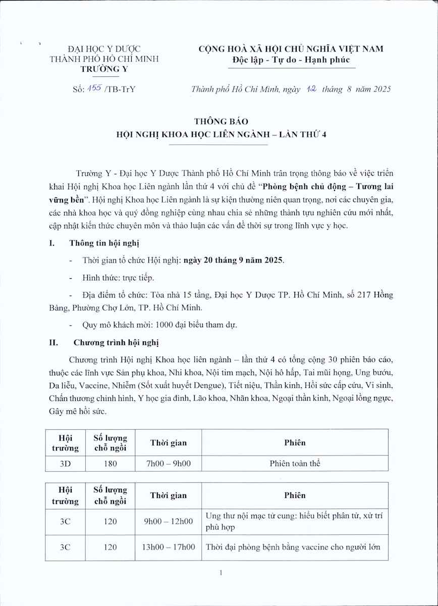 Trường Y - Đại học Y Dược Thành phố Hồ Chí Minh trân trọng thông báo về việc triển khai Hội nghị Khoa học Liên ngành lần thứ 4 với chủ đề “Phòng bệnh chủ động - Tương lai vững bền”. Hội nghị Khoa học Liên ngành là sự kiện thường niên quan trọng, nơi các chuyên gia, các nhà khoa học và quý đồng nghiệp cùng nhau chia sẻ những thành tựu nghiên cứu mới nhất, cập nhật kiến thức chuyên môn và thảo luận các vấn đề thời sự trong lĩnh vực y học.